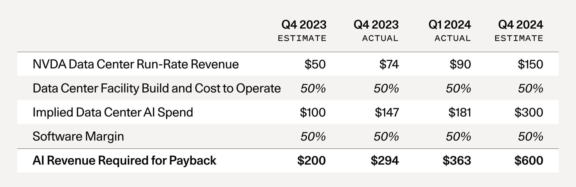 In the article, there’s a table that the author made that calculates the AI revenue required to justify the capex spending. The calculation works like this: first, you take Nvidia's projected revenue and double it to account for the full cost of AI data centers. This doubling is necessary because GPUs represent only half the total cost of ownership, and the other half covers energy, buildings, backup generators, and other infrastructure. Then you double that figure again to account for the profit margins needed by cloud providers like Azure, AWS, or Google Cloud, who must mark up their services to make money when selling AI compute to startups and businesses.