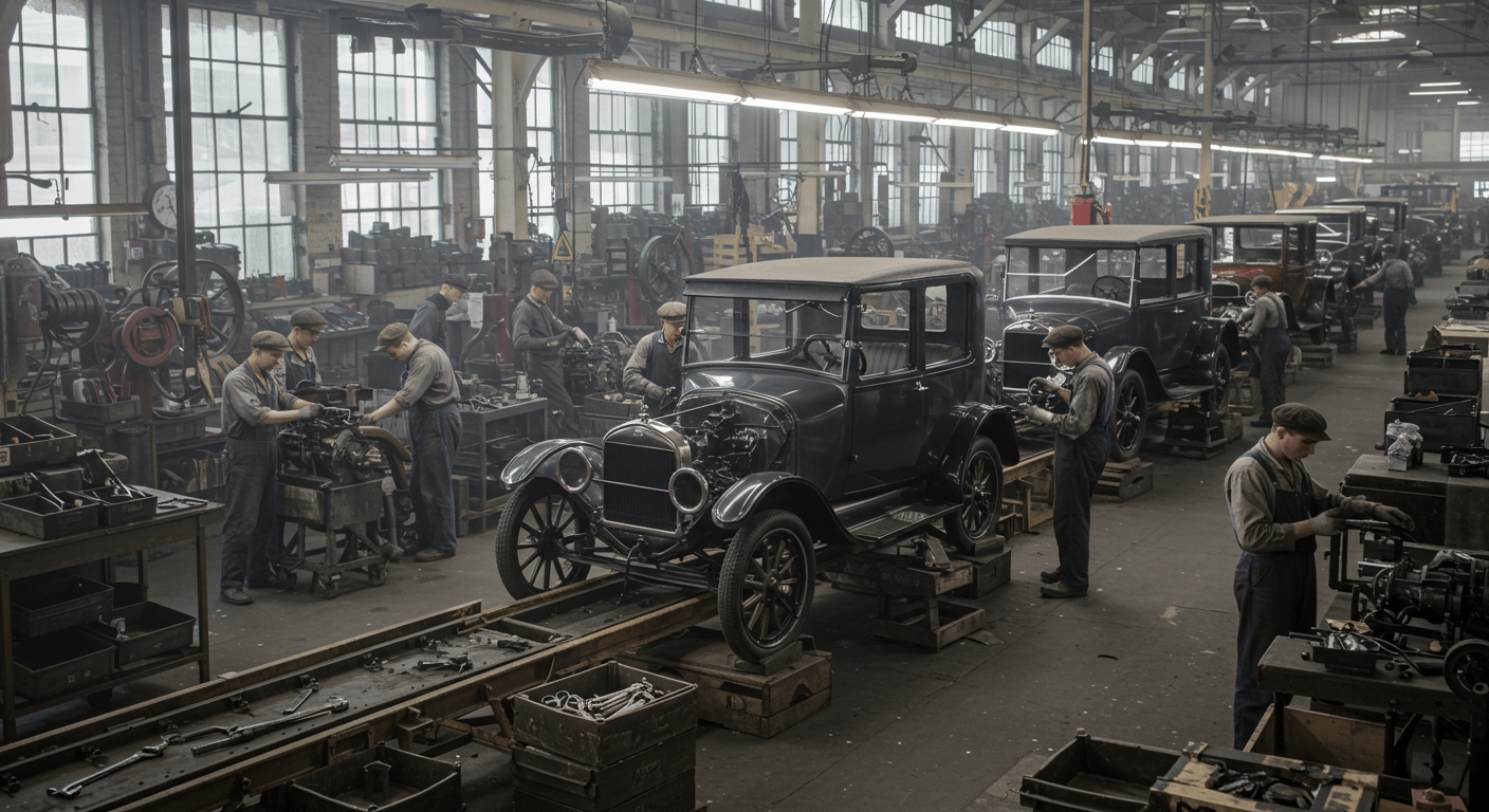 Workers building Model T's in the 1920s in a factory. Made with ImageFX.