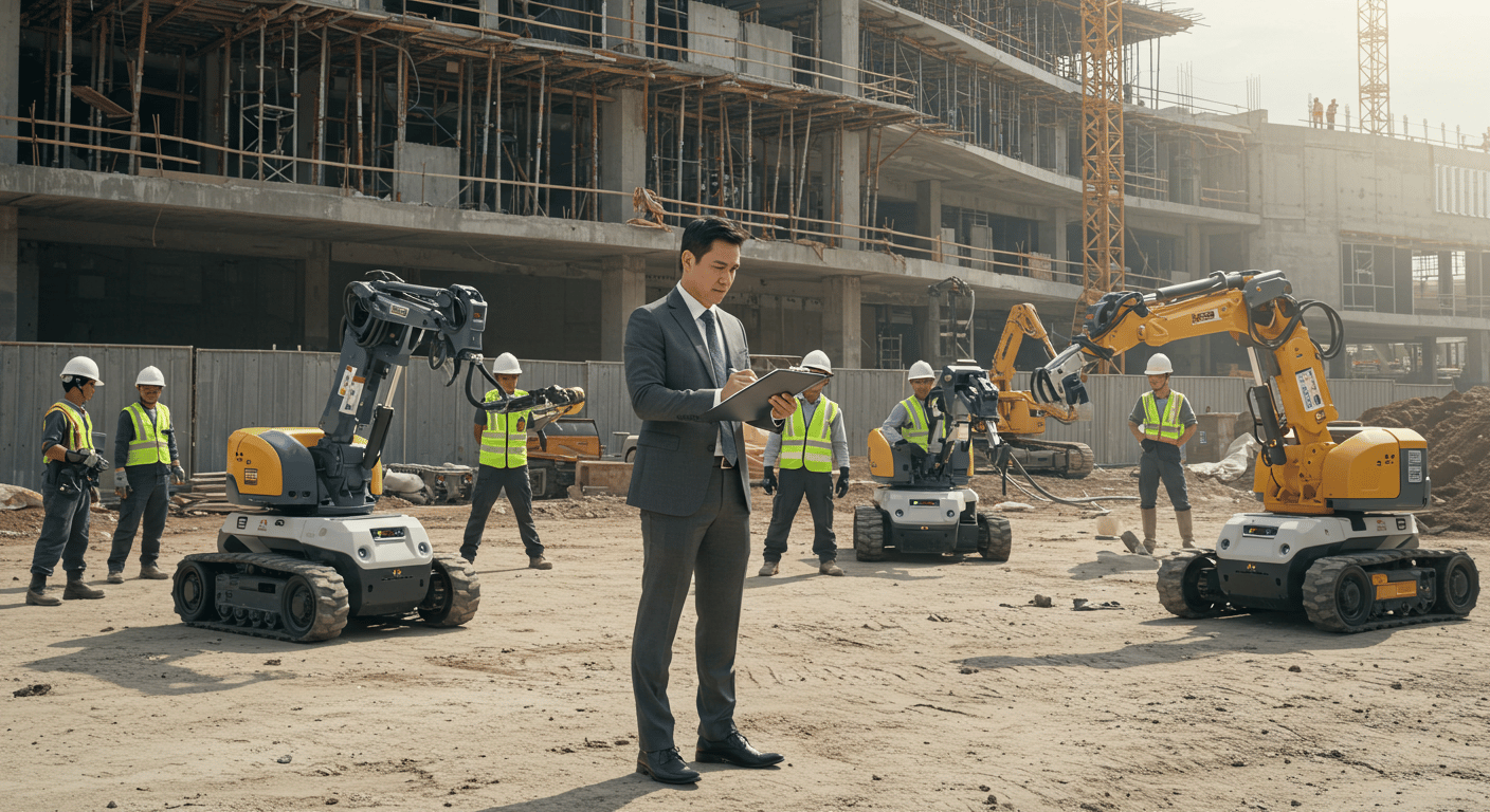 A man in a suit is guiding both construction workers and robots in building a mall in Cebu. Made with ImageFX.