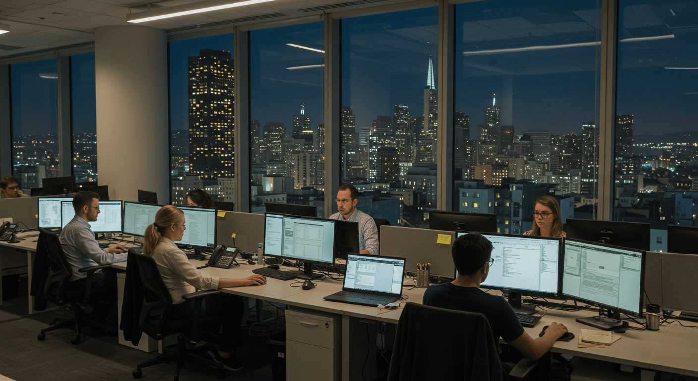 Office workers working late at night in a skyscraper office. The windows show a nice view of downtown SF. Made with ImageFX.